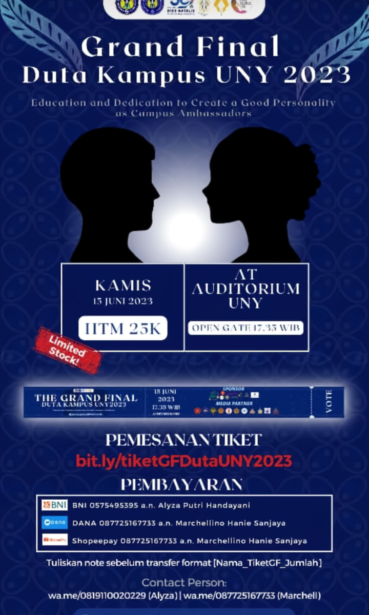 Grand Final Duta Kampus UNY 2023 akan diadakan pada tanggal 15 Juni 2023 pukul 17.35 bertempat di Auditorium UNY. Bagi yang ingin menyaksikan malam Grand Final Duta Kampus dapat memesan tiket pada tautan di bawah ini.